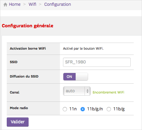 - Enter the Wi-Fi Network Name in the SSID field and click Valider.