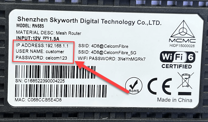 | Username: Password: | customer celcom123 |
