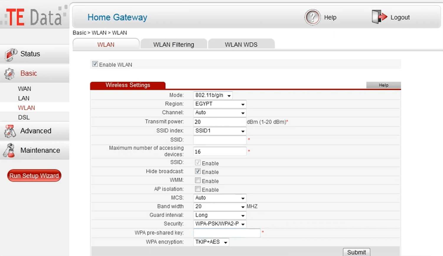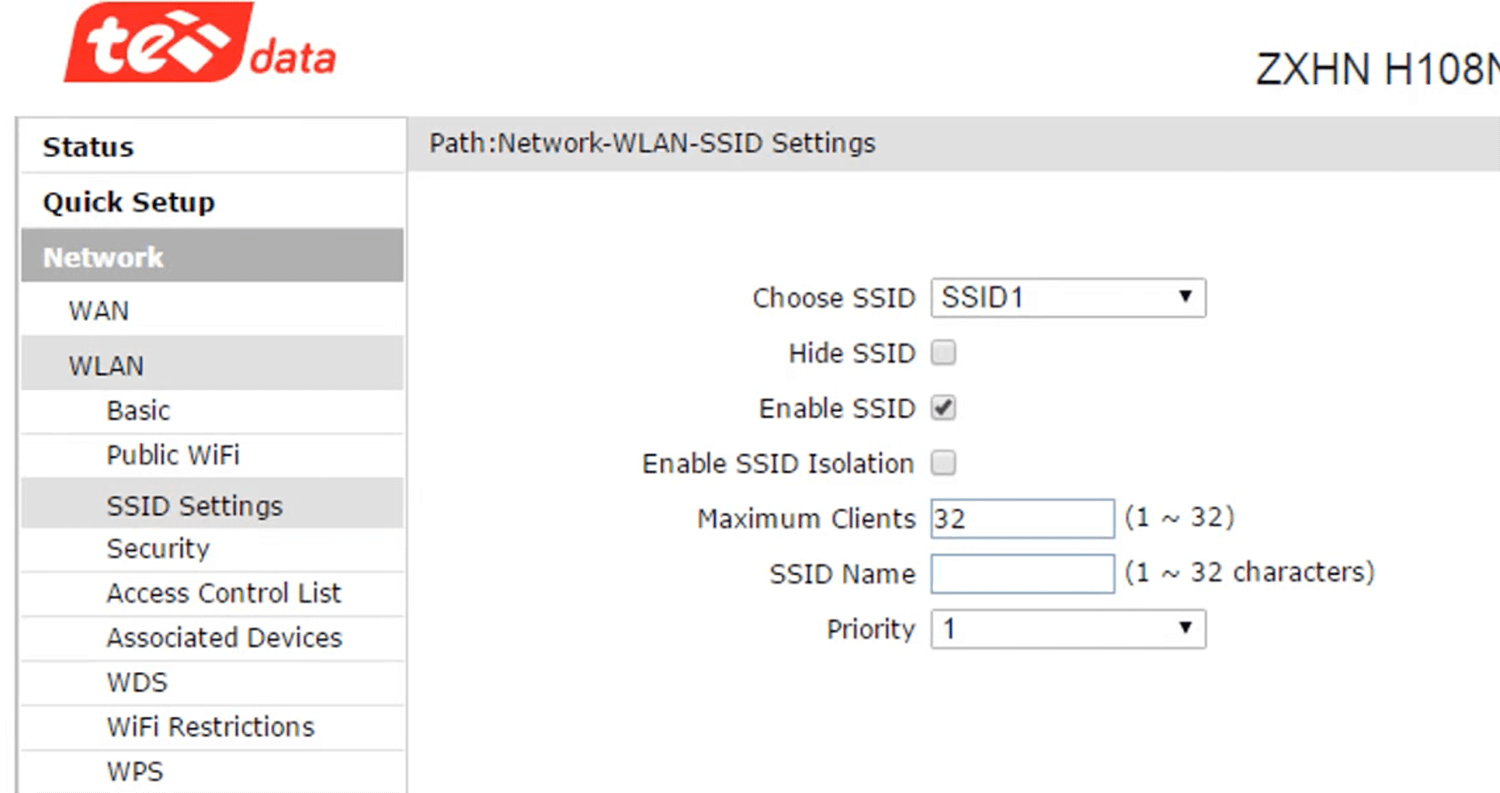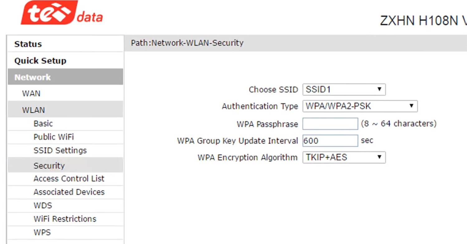 TE Data web-based management page allows you to change WiFi password, Network Name (SSID), and default router settings at http://192.168.1.1.