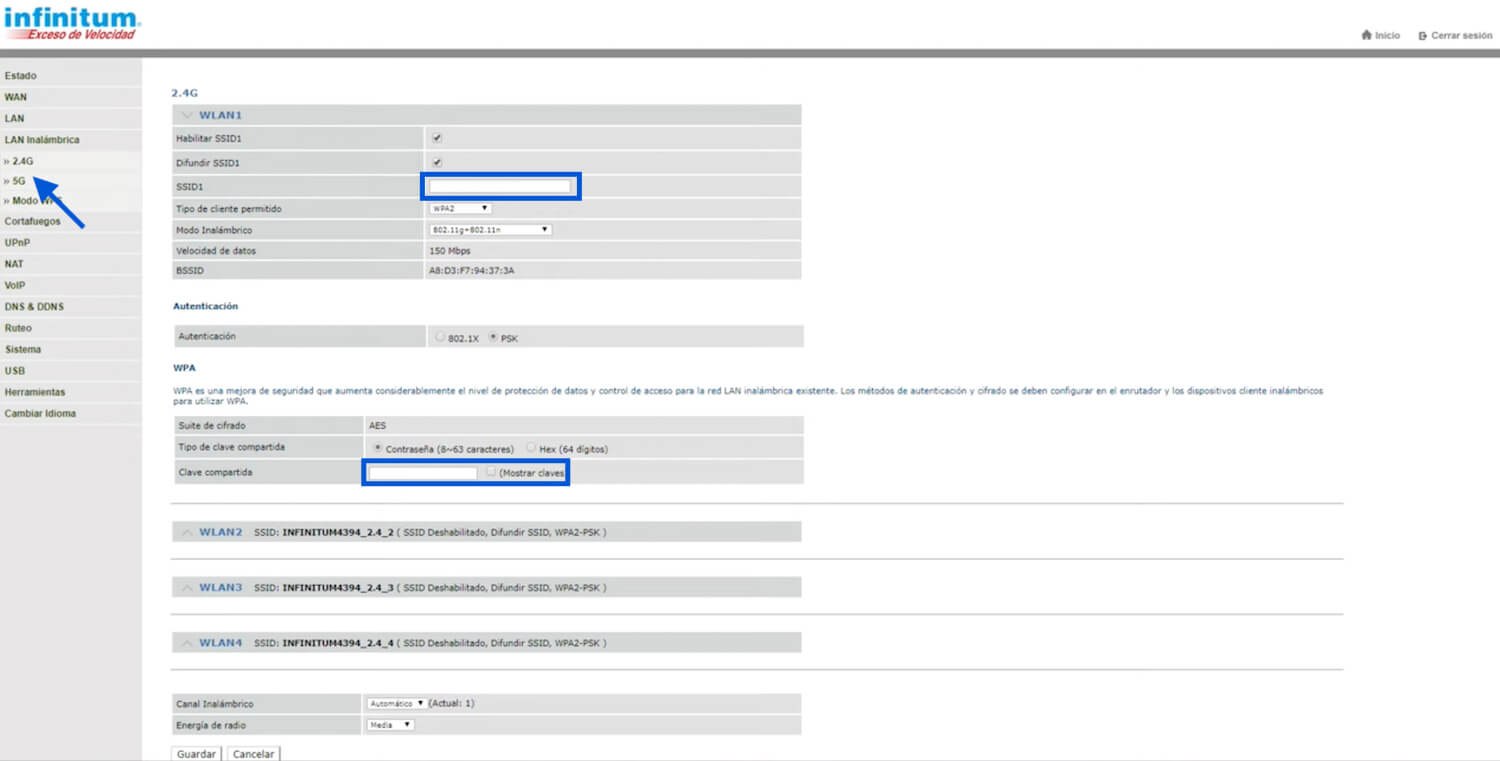 - Select Red from the menu and open Inalambrico (2.4GHz). To configure the 5GHz settings, select Inalambrico (5GHz) option.