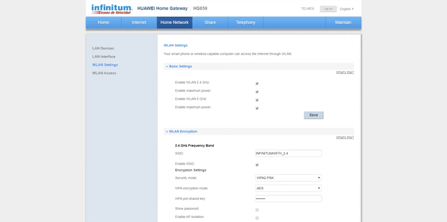 Telmex modem interface allows you to change WiFi password, Network Name (SSID), and default Telmex Infinitum settings at http://192.168.1.254.