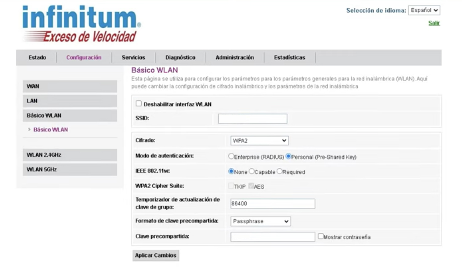- Open Configuración from the menu and select Básico WLAN.