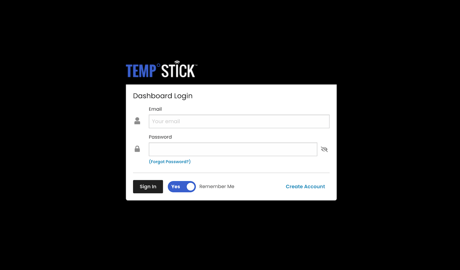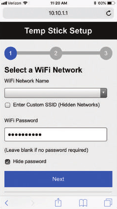 Temp Stick setup page allows you to connect your sensor to a Wi-Fi network and create a new account or assign to existing account at http://10.10.1.1.