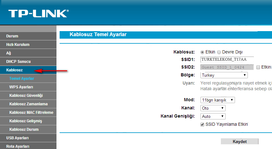 - Enter the Wi-Fi Network Name in the SSID1 field and click Kaydet.