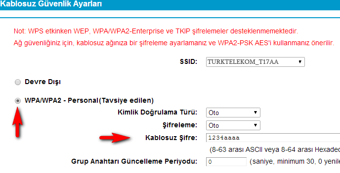 - Enter the Wi-Fi Password in the Kablosuz Şifre field and click Kaydet.