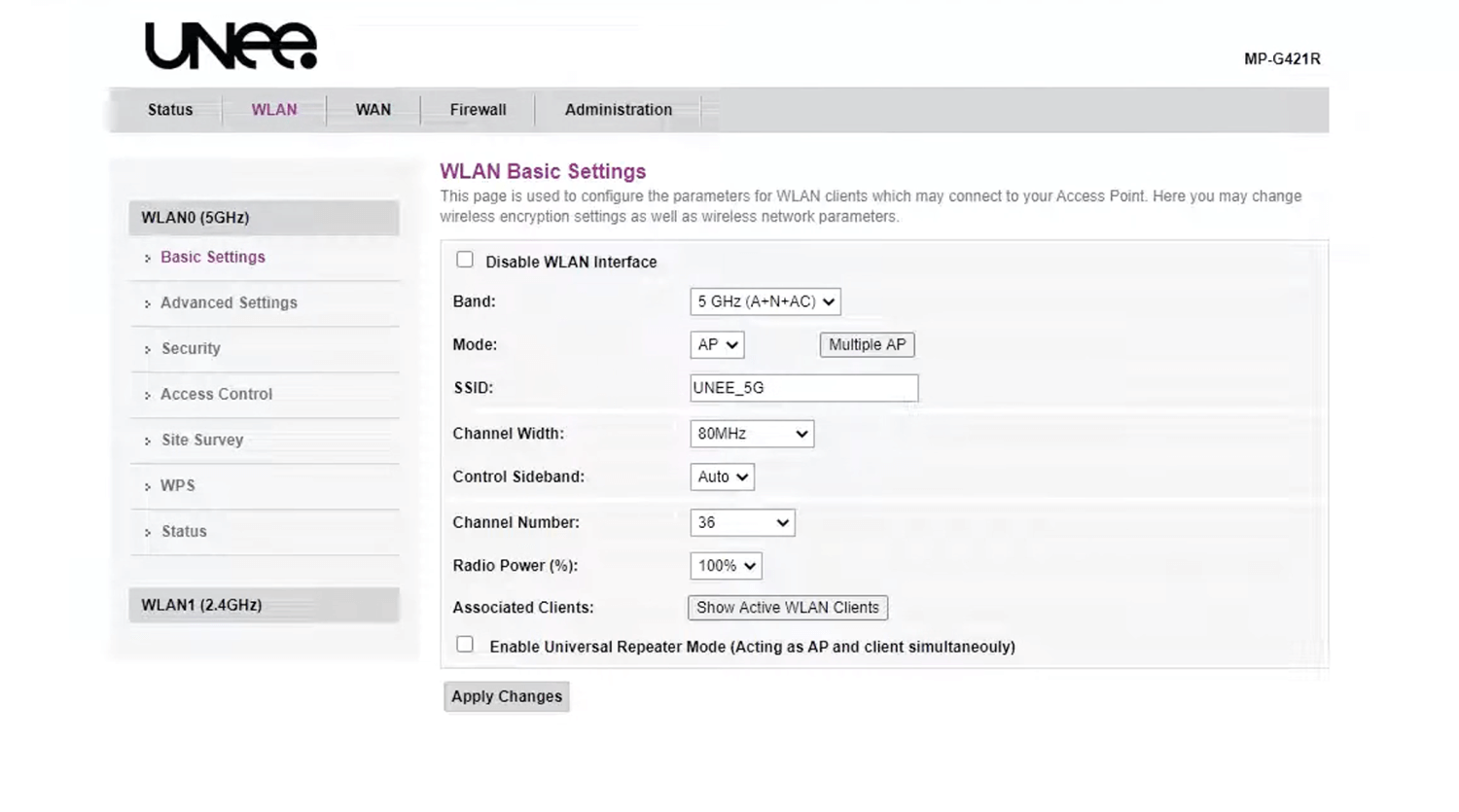 - Select WLAN > WLAN0 (5Ghz) > Basic Settings.