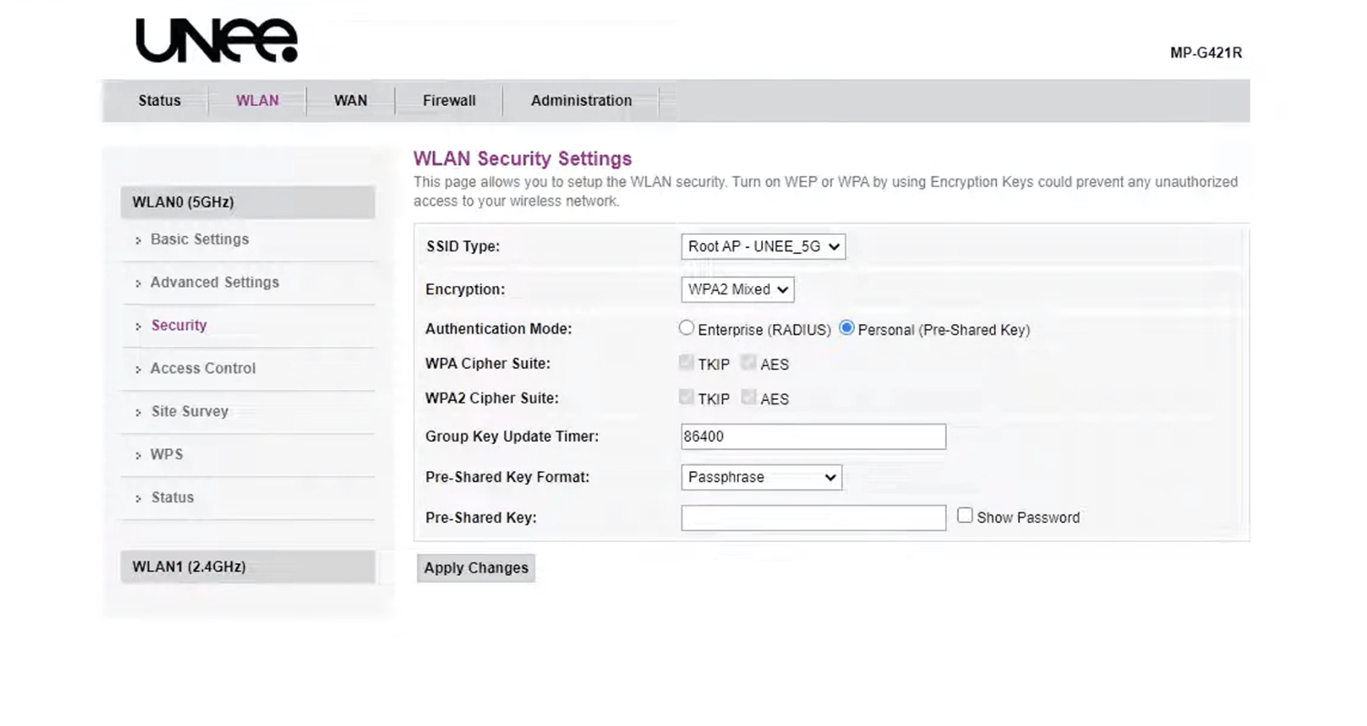 - Enter the Wi-Fi Password in the Pre-Shared Key field and click Apply Changes.