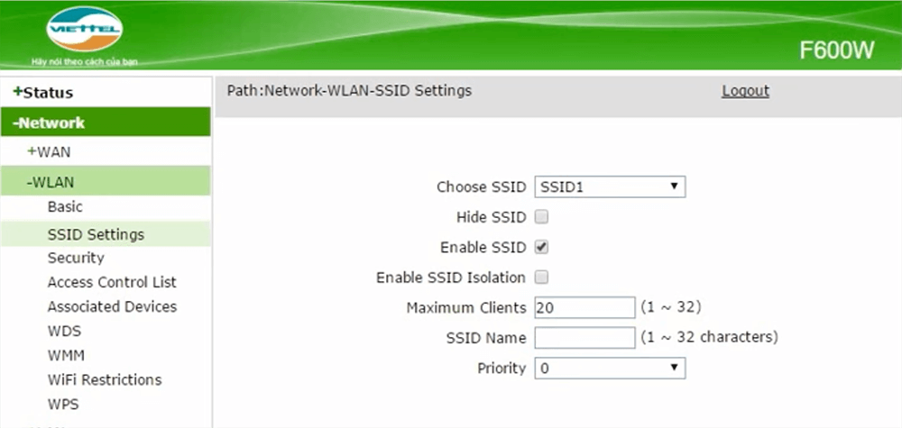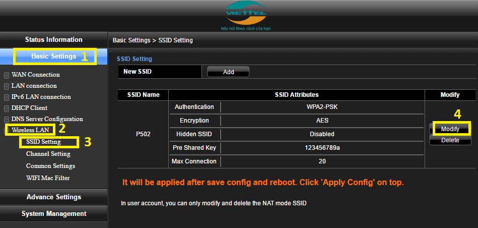 - Go to Basic Settings > Wireless LAN > SSID Setting > Modify.