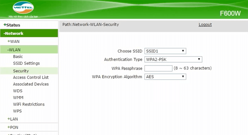 Viettel web-based configuration page allows you to change WiFi password, Network Name (SSID), and default Viettel router settings at http://192.168.1.1.