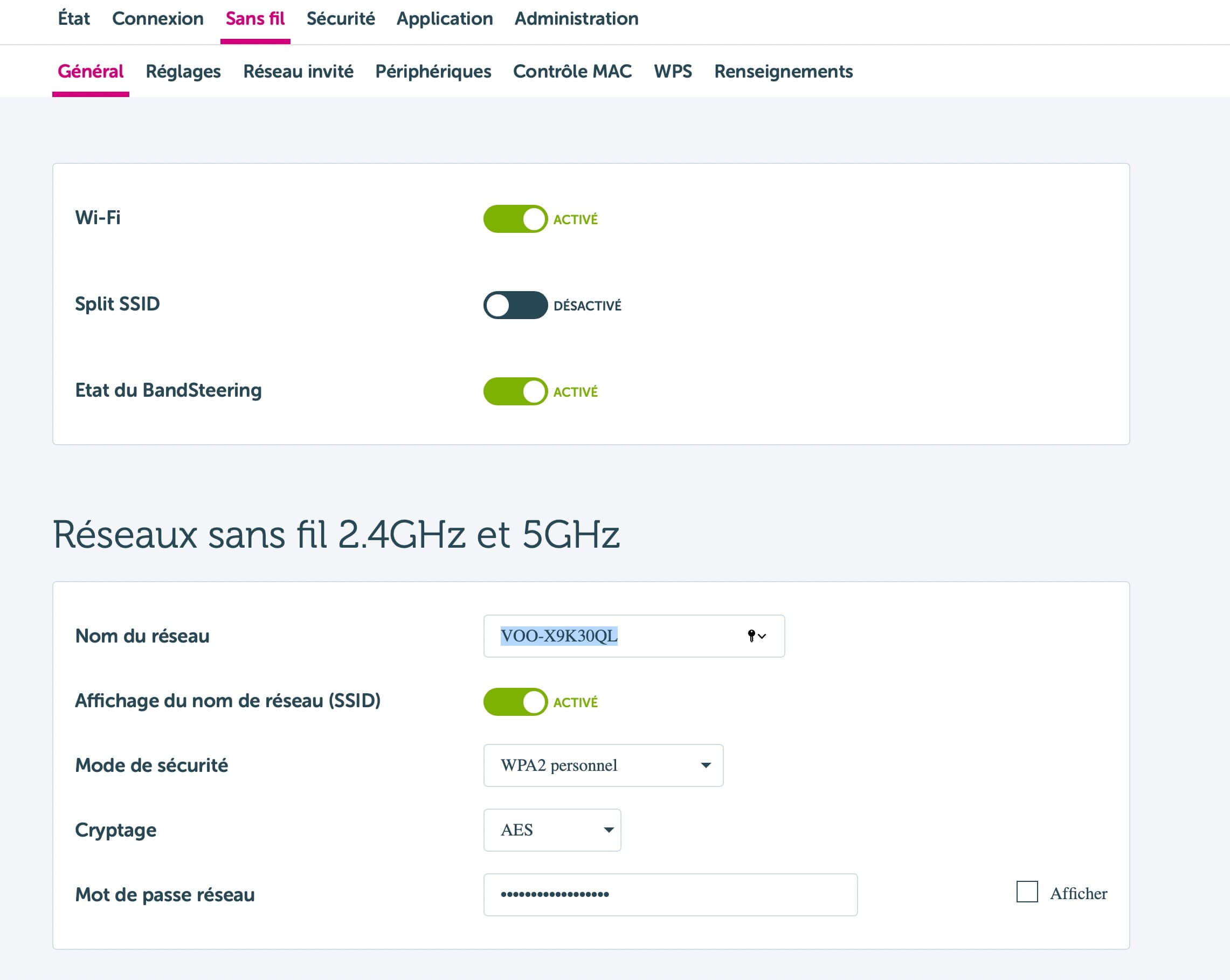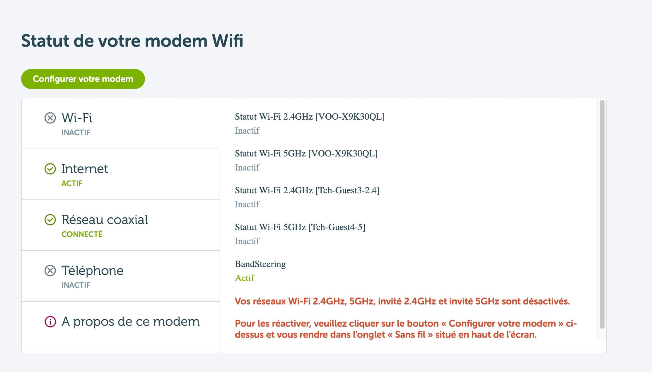 - Select Configurer votre modem > Wifi > Réseau Principal.